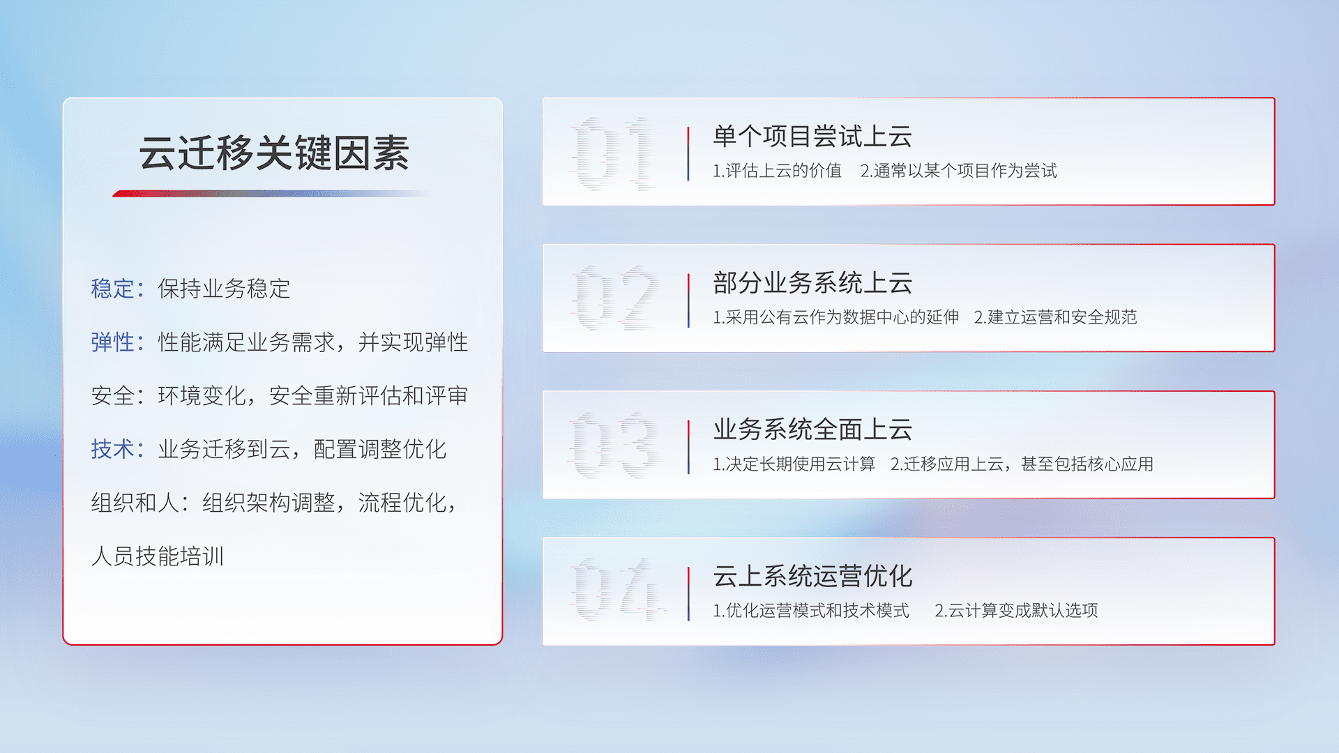 结合实际业务,,,,从规划设计、、、云平台选型、、、云原生改造、、数据迁移、、、、集成交付,,迁移全过程为客户识别最佳上云路径,,,,做好风险识别管理,,,,设计网络架构、、、身份权限、、、安全审计合规、、、操作审计、、、日志审计、、、监控告警策略、、多站点容灾设计等,,,,对云上基础设施进行整体规划,,,提升IT治理水平,,,,以满足弹性、、、高可用、、、、高性能的需求。。