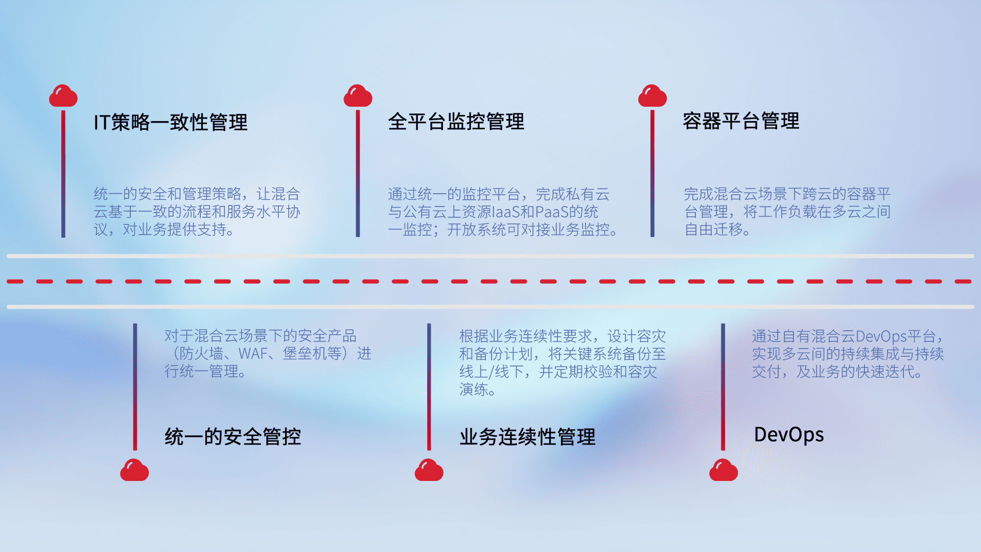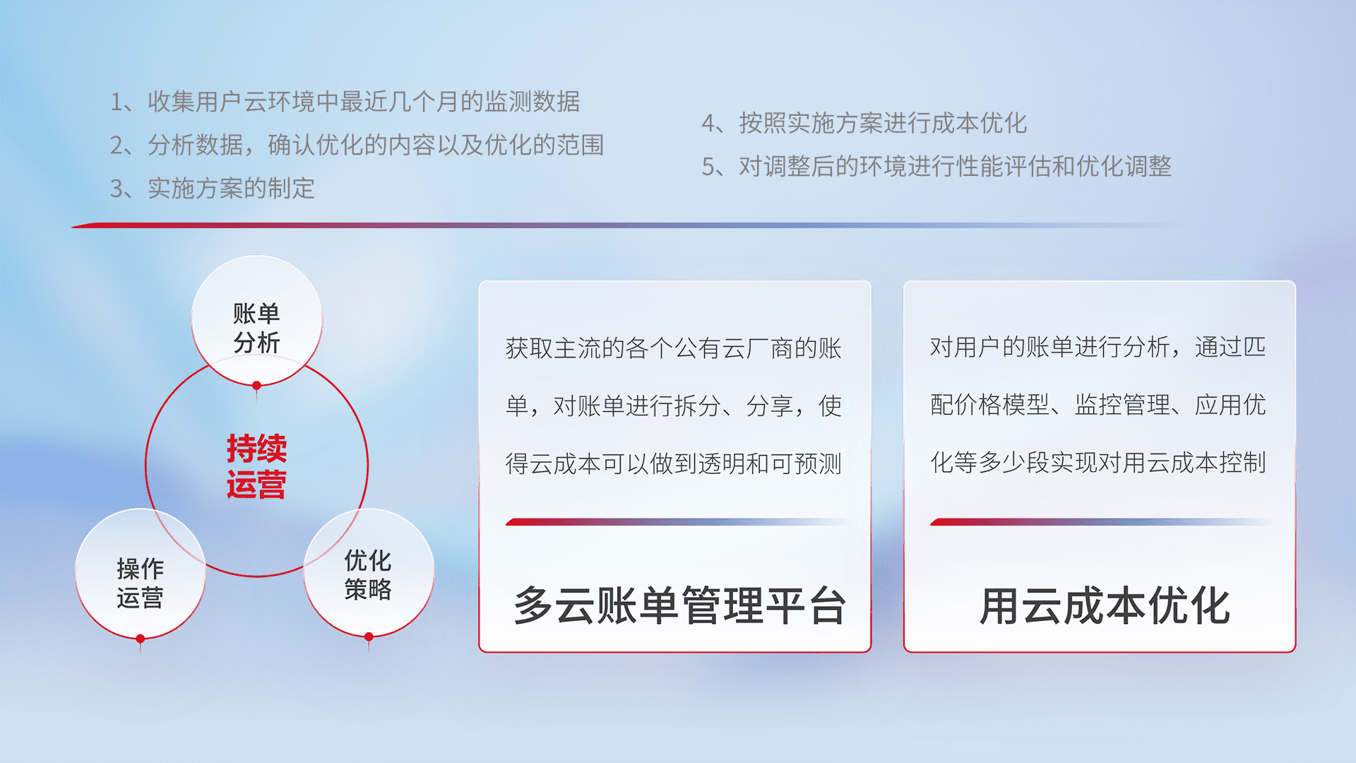 通过多云纳管,,以统一的资源数据模型把客户的云资源进行抽象和封装,,进而实现对多云资源的统一操作,,保障云资源管理的可靠性、、、、稳定性与可用性。。。。量身定制化运维内容,,配置、、、、开发运维、、补丁管理、、、备份、、、监控、、、、认证和访问管理、、审计和日常巡检等,,保障在用云过程中的可靠度,,稳定度以及高可用率。。