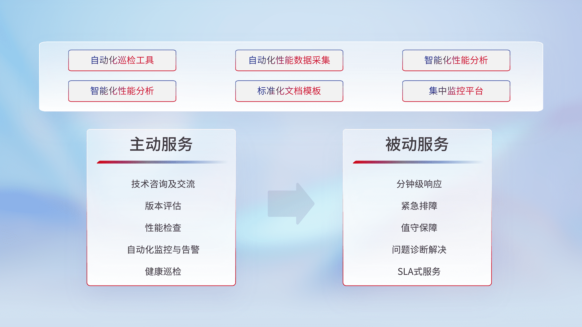 智能化工具和标准化文档,,保障服务质量,,,提供主动服务(包含技术咨询、、版本评估、、、性能检查、、自动化监控与告警、、健康巡检)和被动服务包含(分钟级响应、、、、紧急排障、、、、值守保障、、问题诊断解决、、、SLA服务)。。
